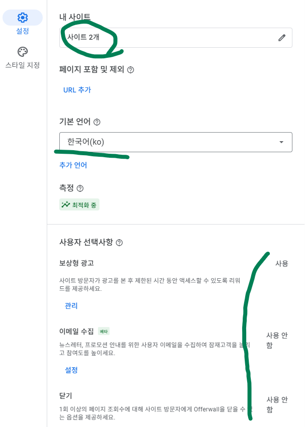 2.사이트 선택 클릭후 사이트 전체선택, 언어 설정, 광고 설정하기