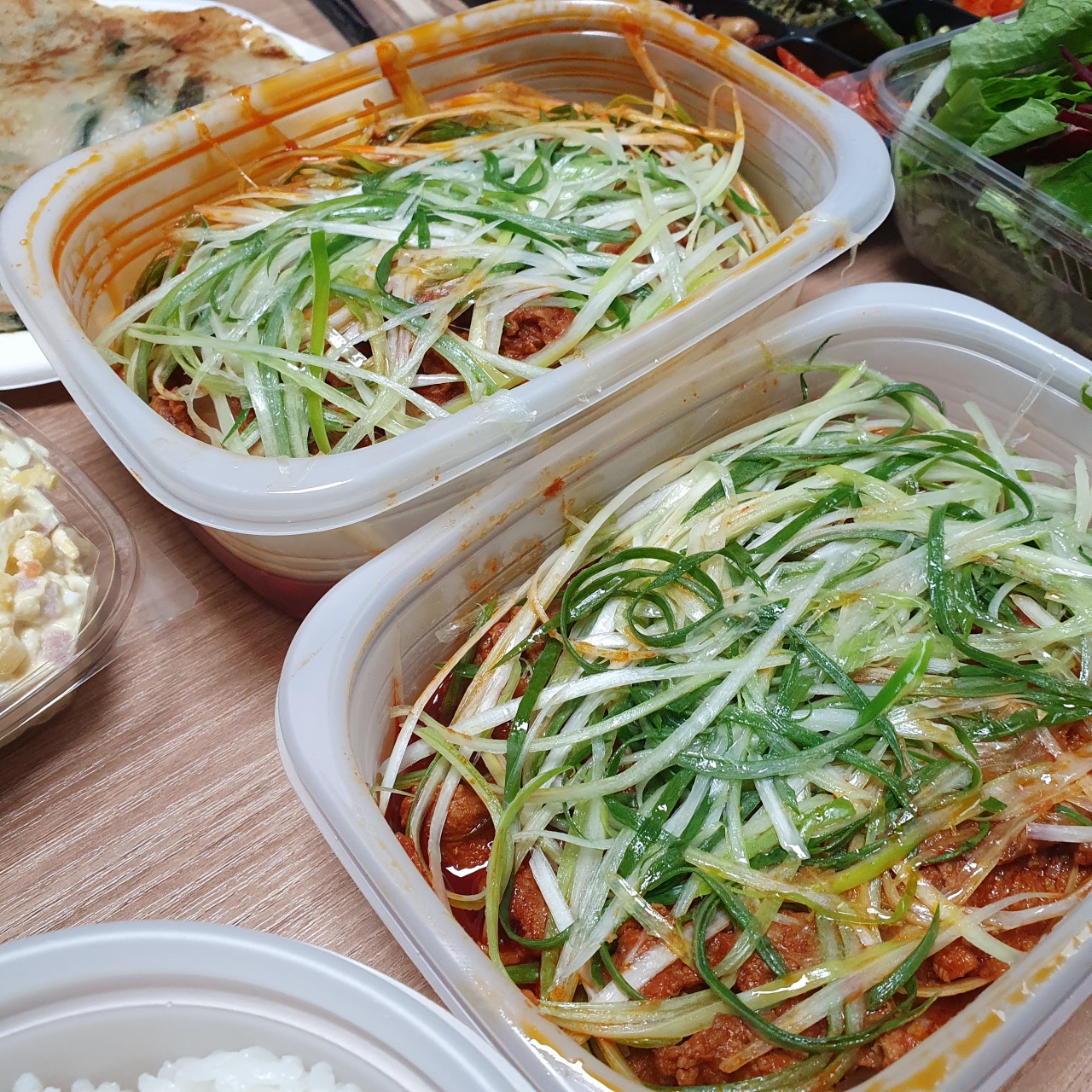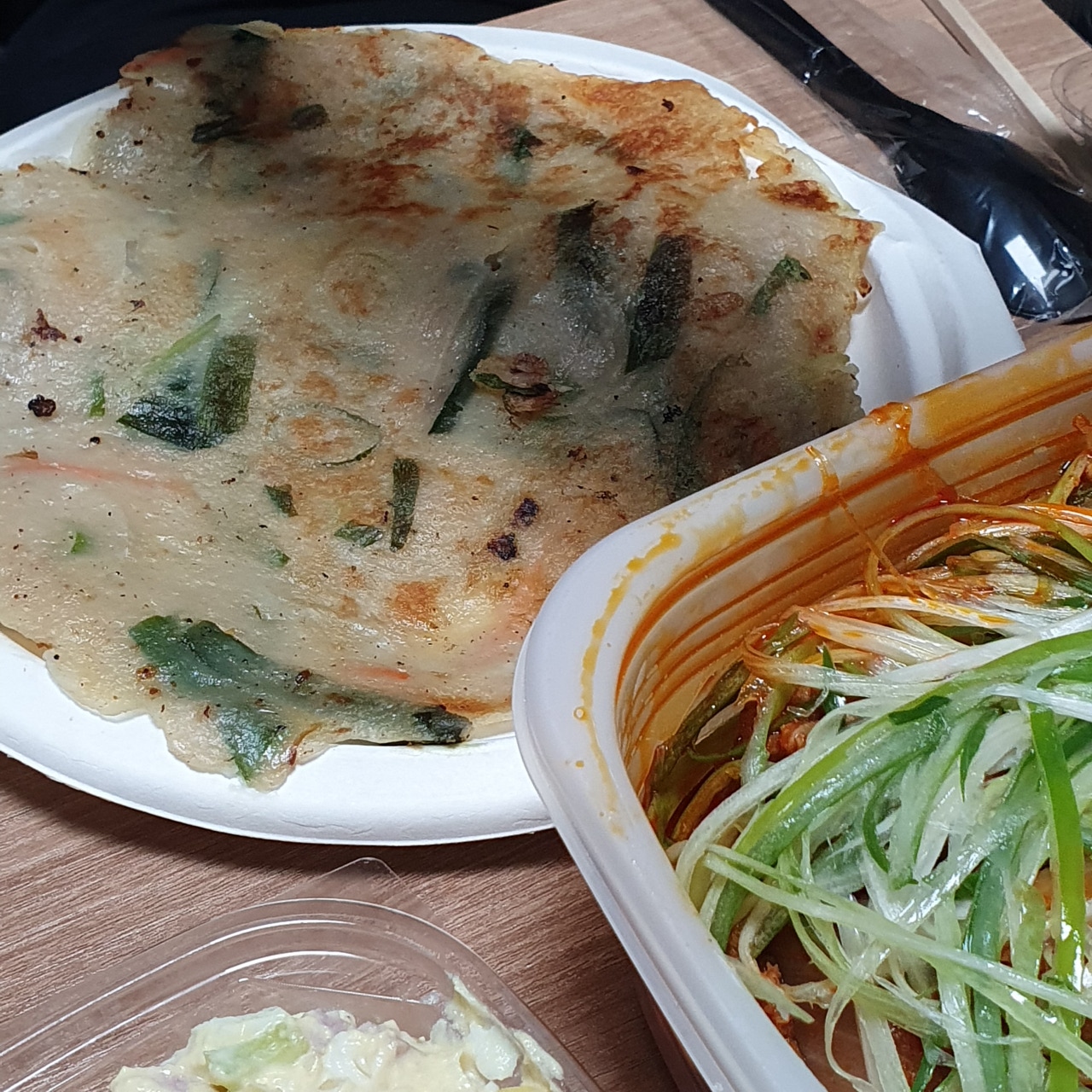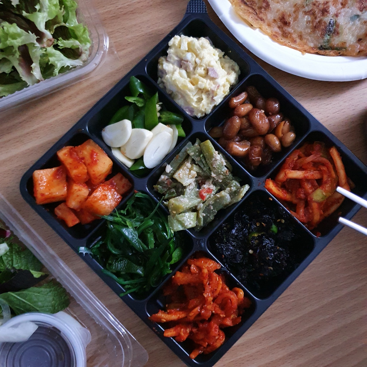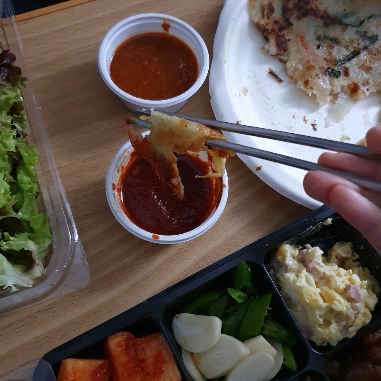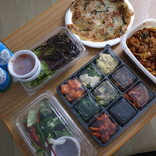 이어지는 감탄사... 일단 그냥 딱 봐도 3층석탑은 기본인 양 쌓여있습니다. 내가 시킨 게 곱창일 텐데 이건 다 뭐지? 하며 하나하나 살펴보았답니다. 첫 번째로 저를 반겨준 건 쌈채소들과 양념장 그리고 가게에 가면 기본 안주(?)로 주시는 전입니다!! 전 진짜 맛있는데!! 너무 반가웠어요! 배달에서도 전을 만나다니 이건 정말 엄청난 서비스라고 볼 수 있겠습니다.
