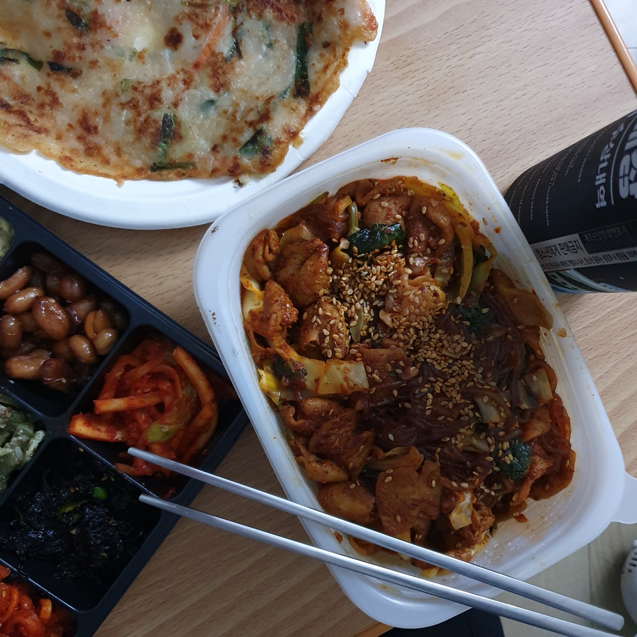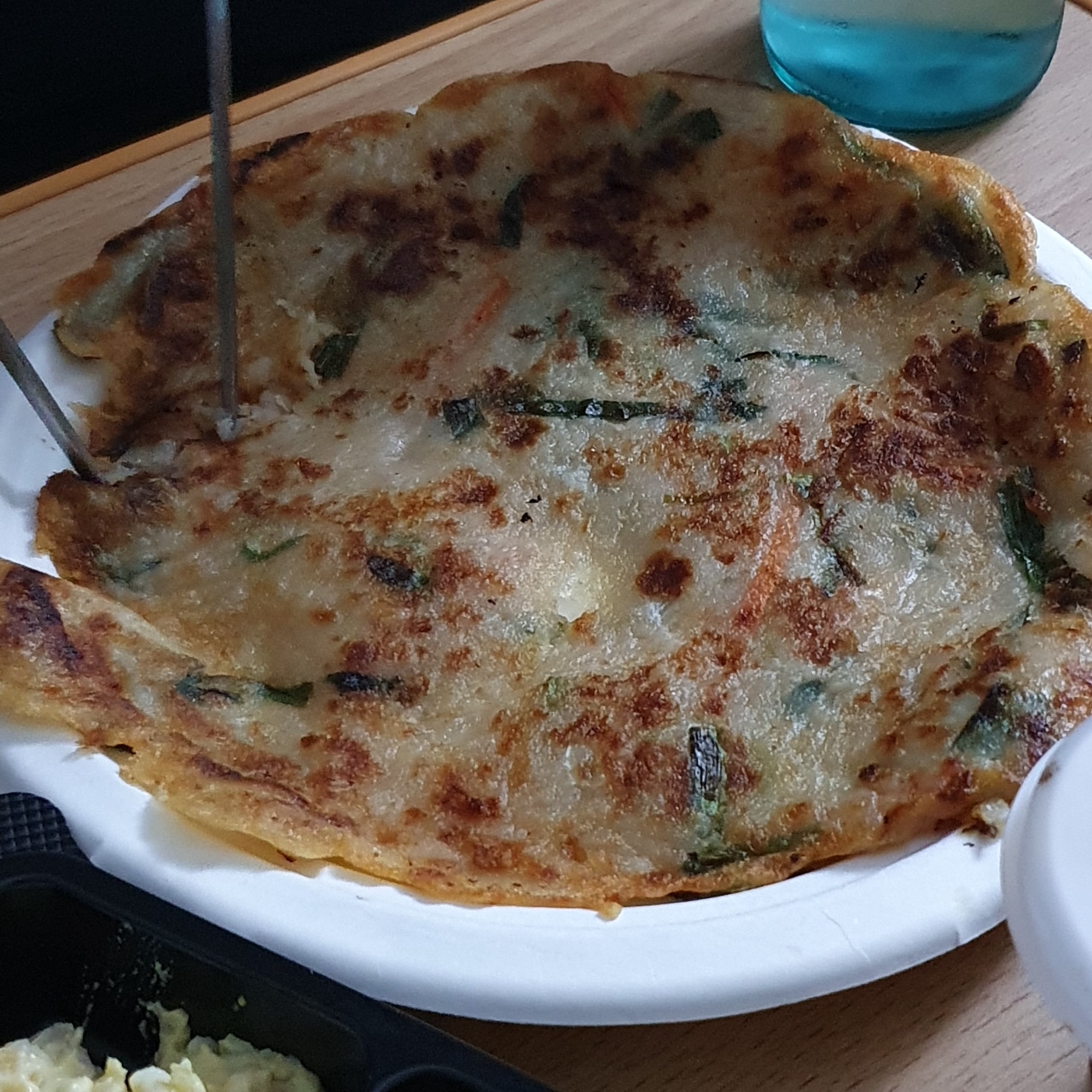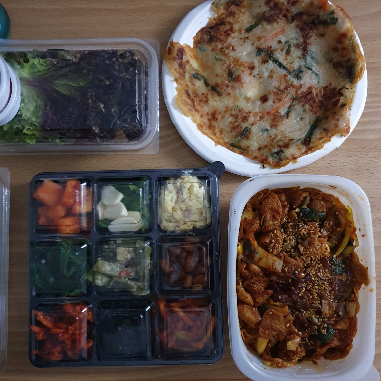 이어지는 감탄사... 일단 그냥 딱 봐도 3층석탑은 기본인 양 쌓여있습니다. 내가 시킨 게 곱창일 텐데 이건 다 뭐지? 하며 하나하나 살펴보았답니다. 첫 번째로 저를 반겨준 건 쌈채소들과 양념장 그리고 가게에 가면 기본 안주(?)로 주시는 전입니다!! 전 진짜 맛있는데!! 너무 반가웠어요! 배달에서도 전을 만나다니 이건 정말 엄청난 서비스라고 볼 수 있겠습니다.