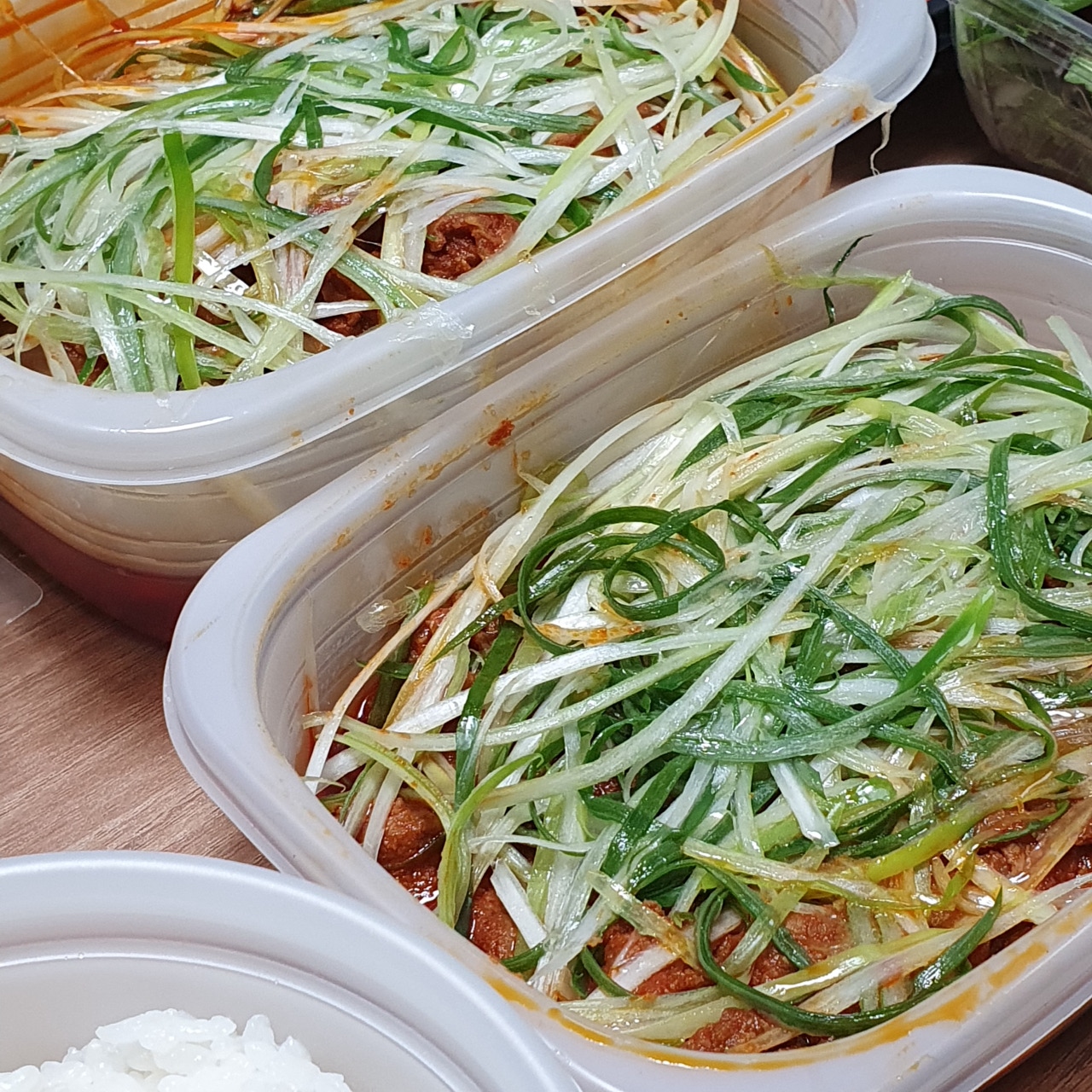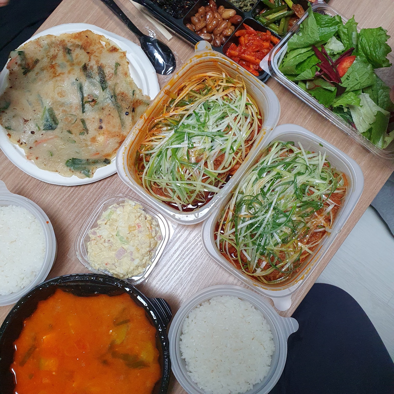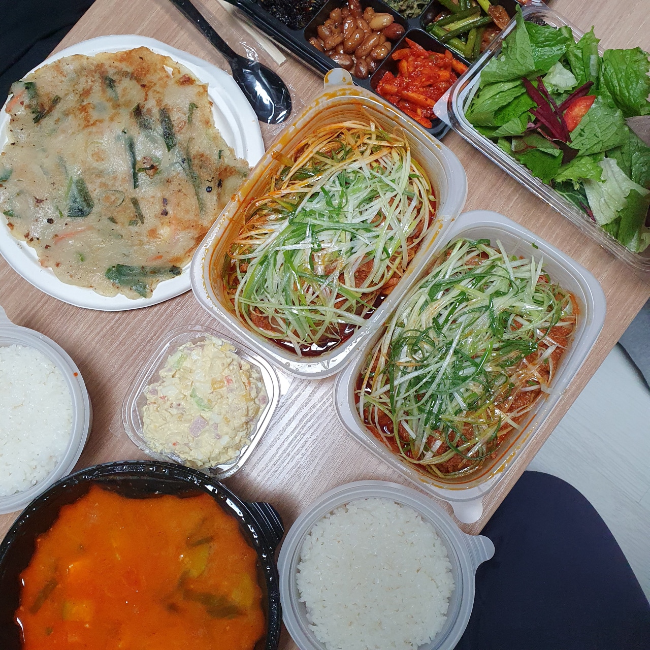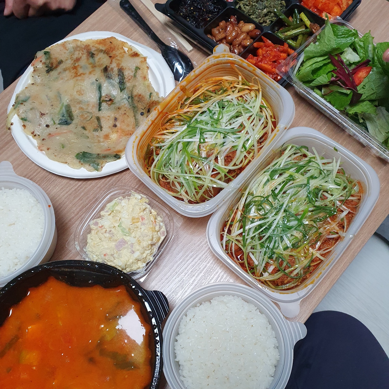 이어지는 감탄사... 일단 그냥 딱 봐도 3층석탑은 기본인 양 쌓여있습니다. 내가 시킨 게 곱창일 텐데 이건 다 뭐지? 하며 하나하나 살펴보았답니다. 첫 번째로 저를 반겨준 건 쌈채소들과 양념장 그리고 가게에 가면 기본 안주(?)로 주시는 전입니다!! 전 진짜 맛있는데!! 너무 반가웠어요! 배달에서도 전을 만나다니 이건 정말 엄청난 서비스라고 볼 수 있겠습니다.