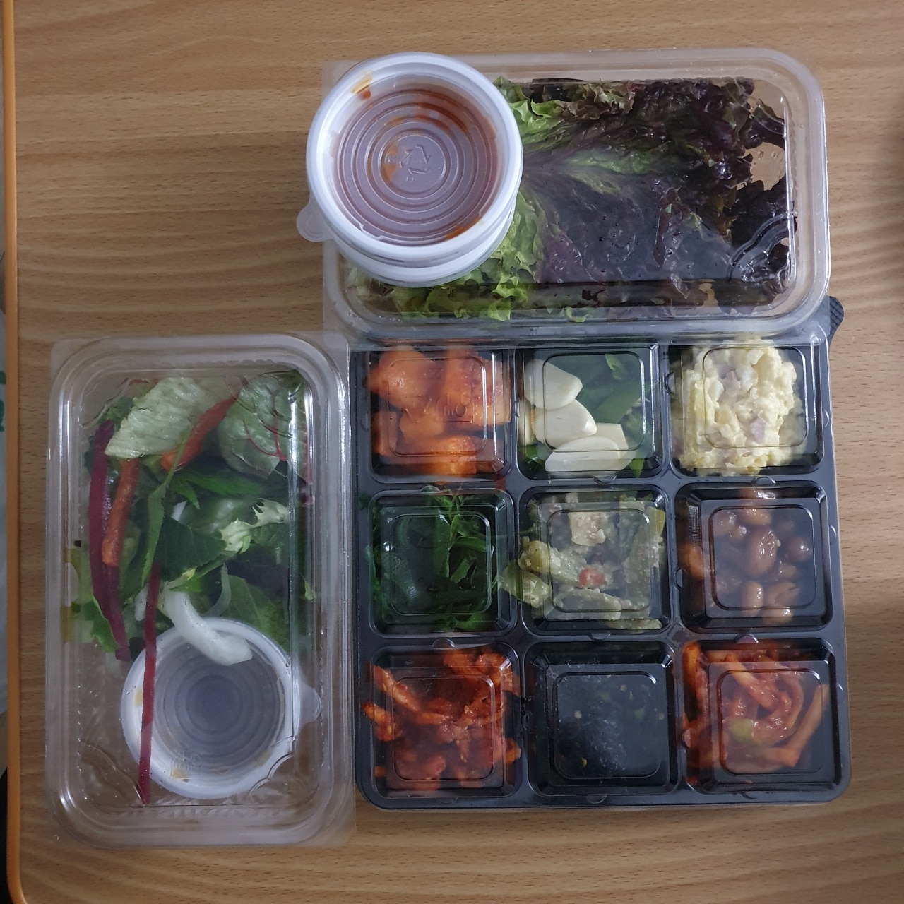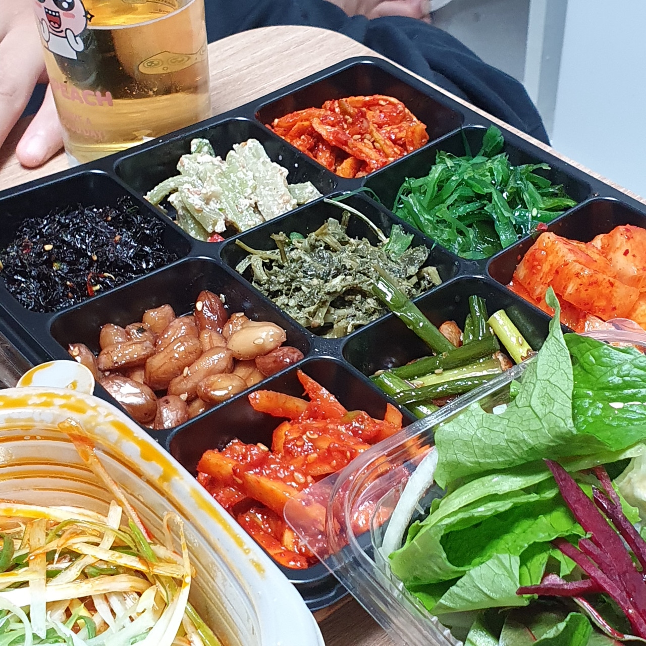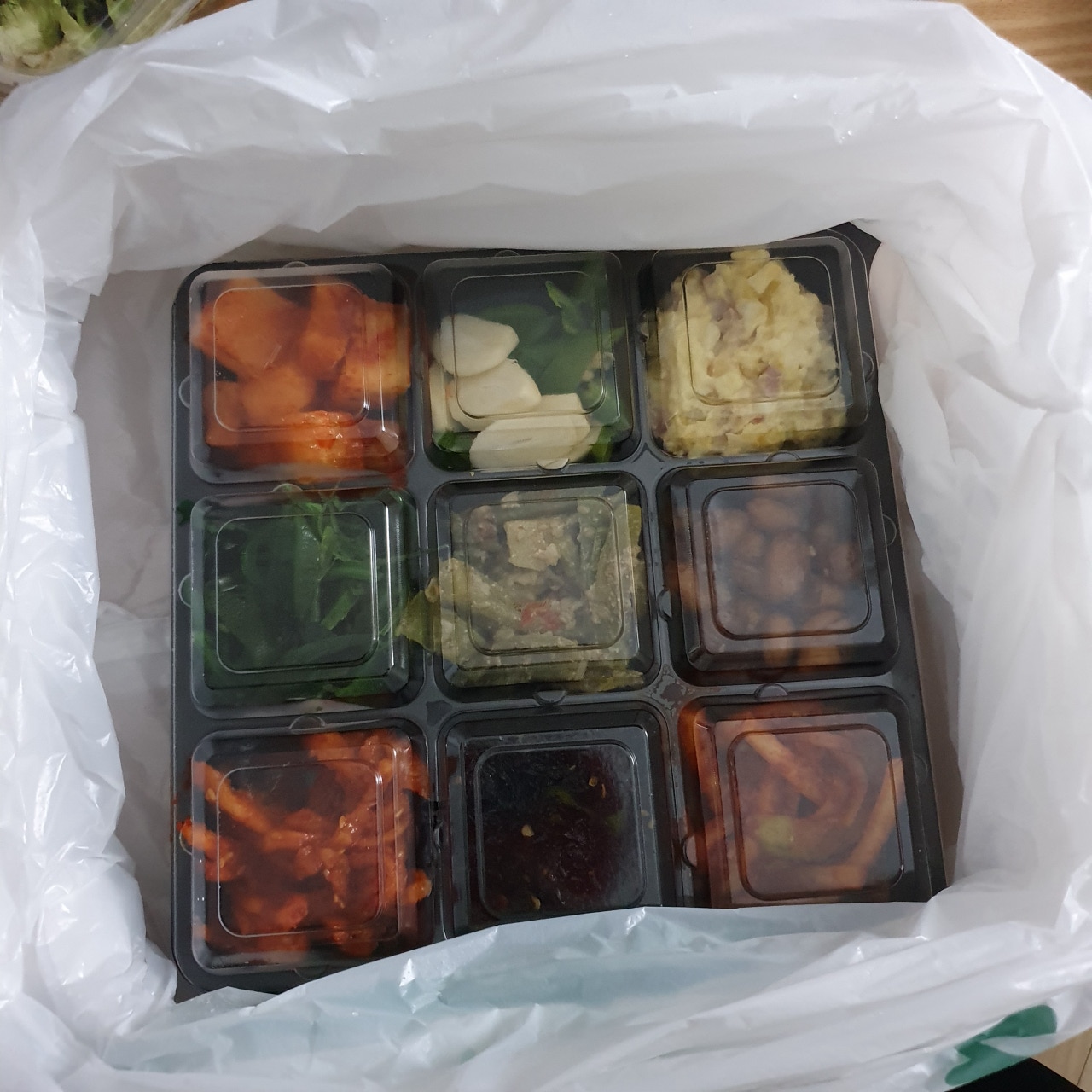 2층에는 샐러드와 샐러드 소스가 같이 투명플라스틱팩에 있었고요, 보온팩에 곱창이 담겨 왔습니다. 곱창의 무게는 묵직했습니다!! 두 명이서 먹기에 배 터지게 먹기 가능한 양이었어요 아래 사진으로 자세히 보여드릴게요! 그리고 마지막층에는 빼꼼 보이는데 3 × 3 배열의 반찬이 왔답니다... 와 저는 반찬 양 보고도 또 놀랬자나여! 깍두기 무말랭이 콘샐러드 땅콩