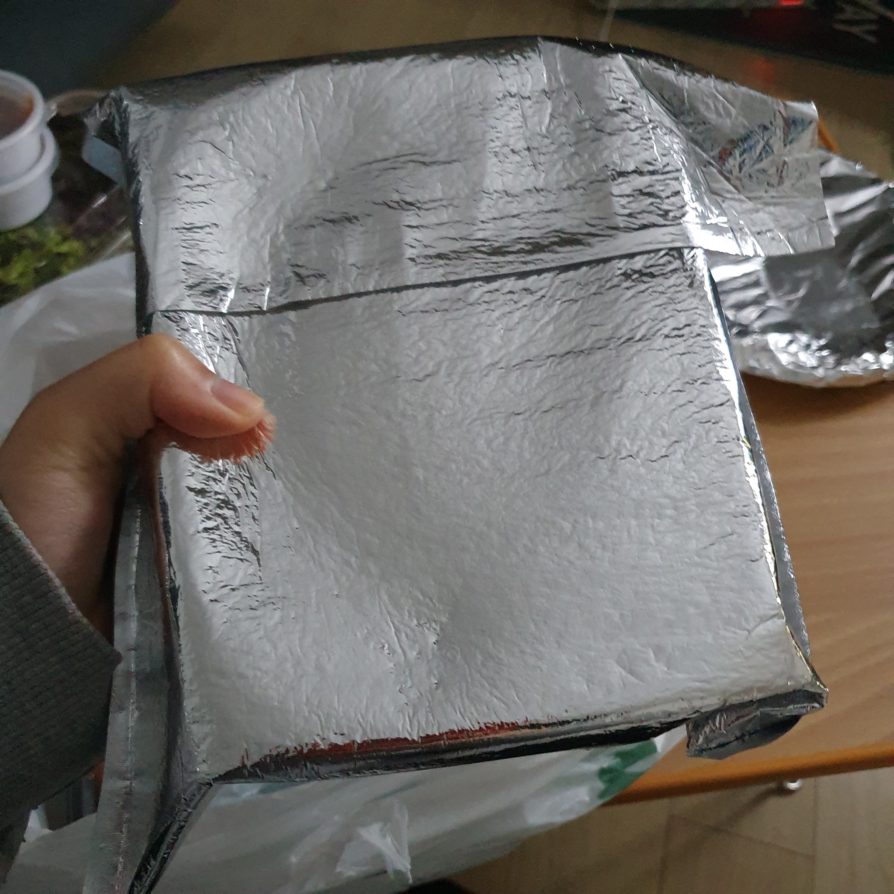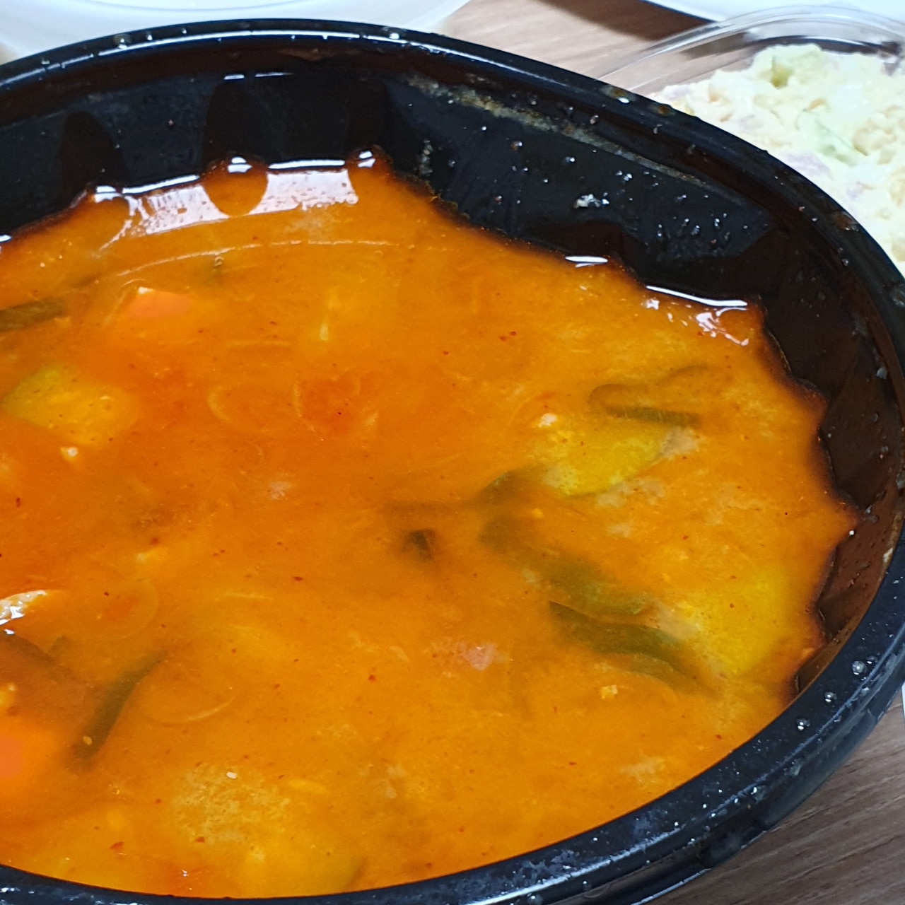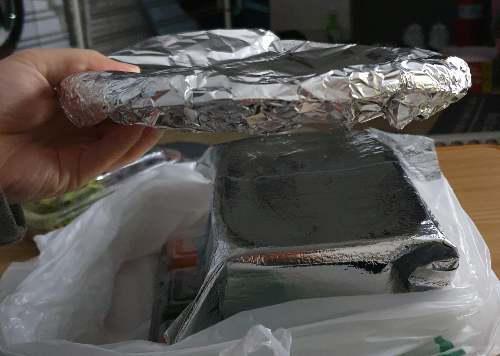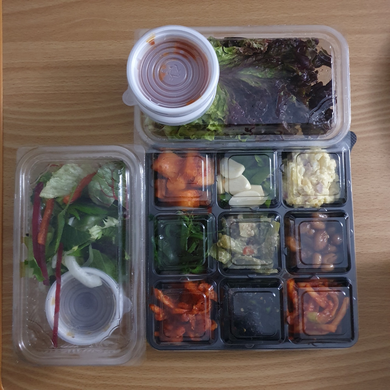 2층에는 샐러드와 샐러드 소스가 같이 투명플라스틱팩에 있었고요, 보온팩에 곱창이 담겨 왔습니다. 곱창의 무게는 묵직했습니다!! 두 명이서 먹기에 배 터지게 먹기 가능한 양이었어요 아래 사진으로 자세히 보여드릴게요! 그리고 마지막층에는 빼꼼 보이는데 3 × 3 배열의 반찬이 왔답니다... 와 저는 반찬 양 보고도 또 놀랬자나여! 깍두기 무말랭이 콘샐러드 땅콩