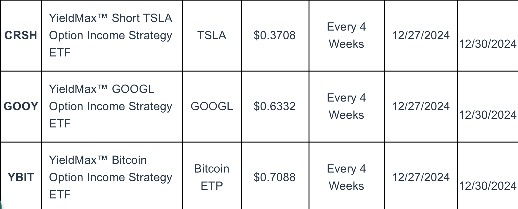 TSLY, CRSH, GOOY, YBIT, OARK, XOMO, SNOY, TSMY, FEAT, FIVY
