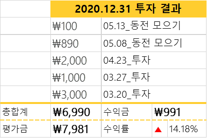12월31일 현재 수익률은 14.18%이며 수익금은 991원 입니다