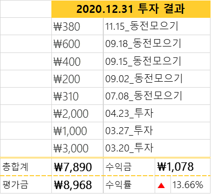 중간 중간 아쉬운 수익률이 나와서 동전 모으기를 중단한 상태입니다. 그래서 투자금이 제일 적습니다.