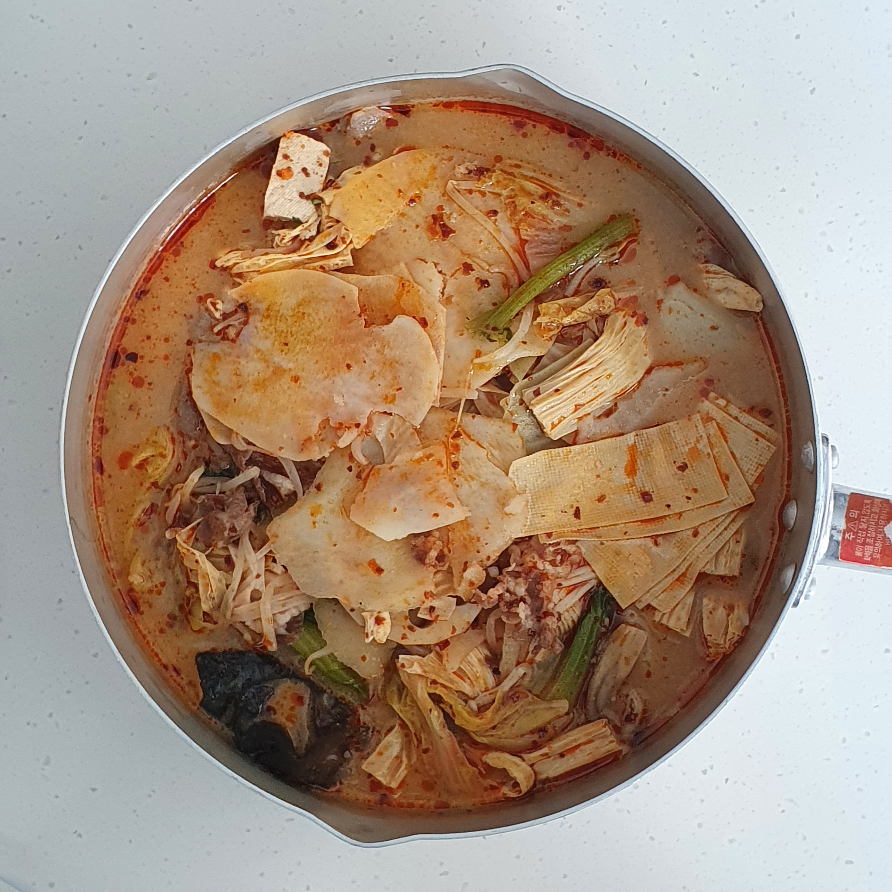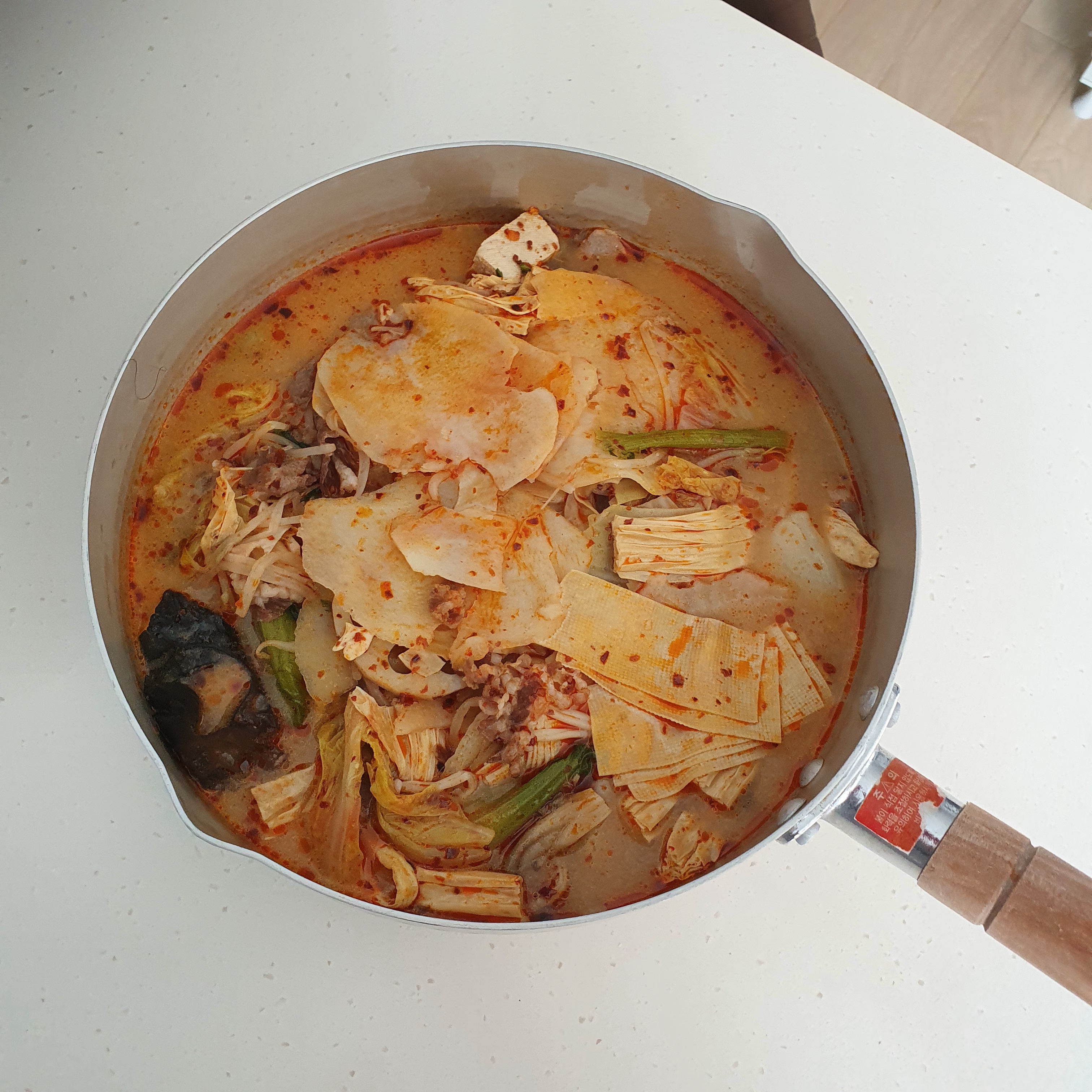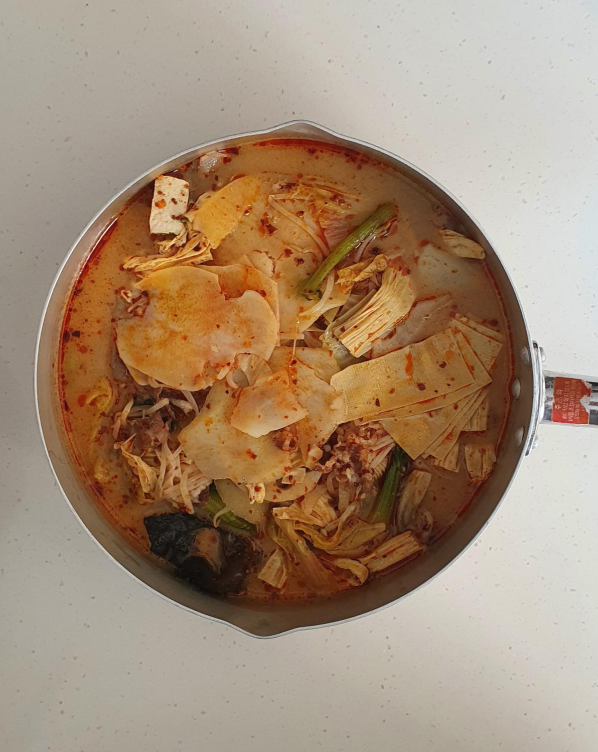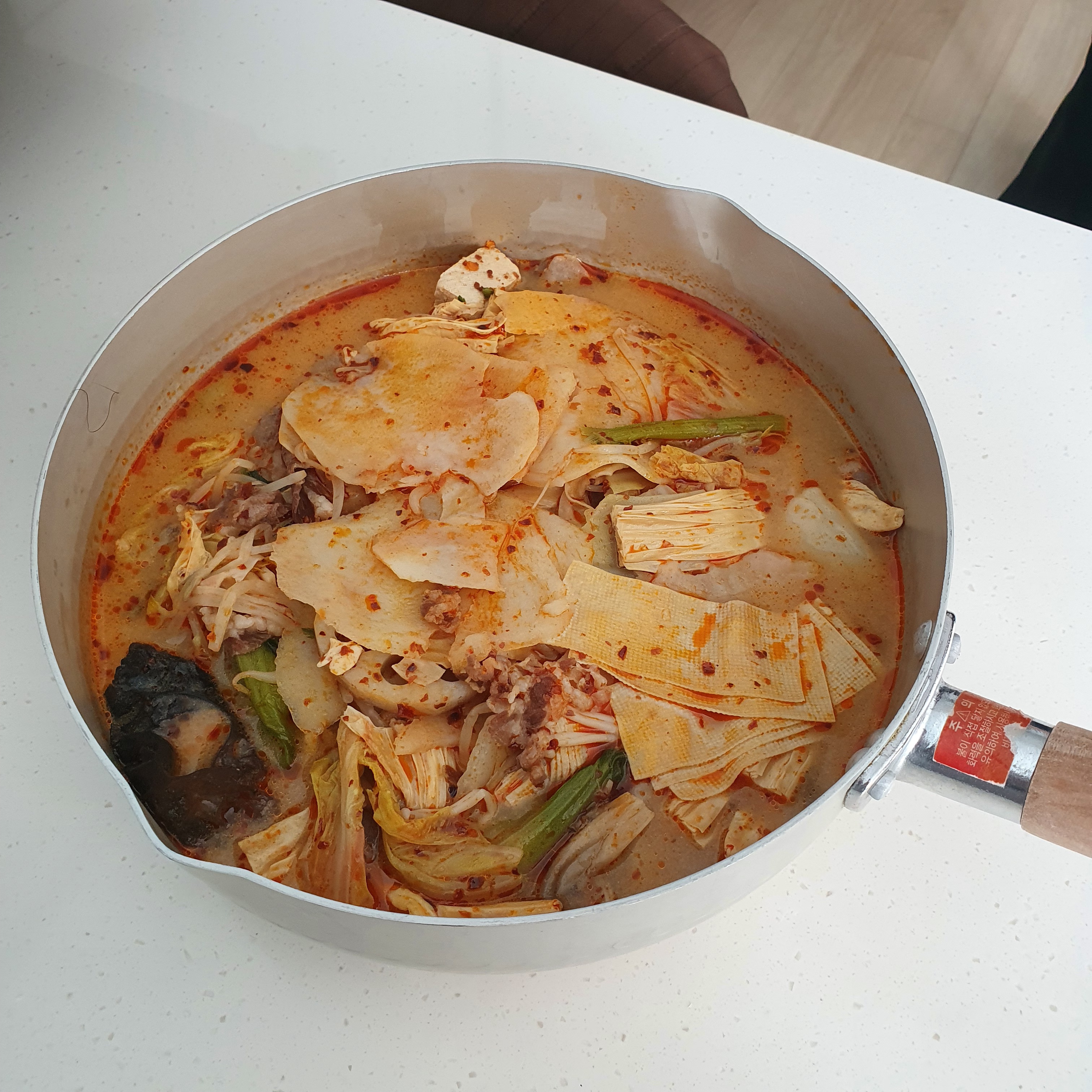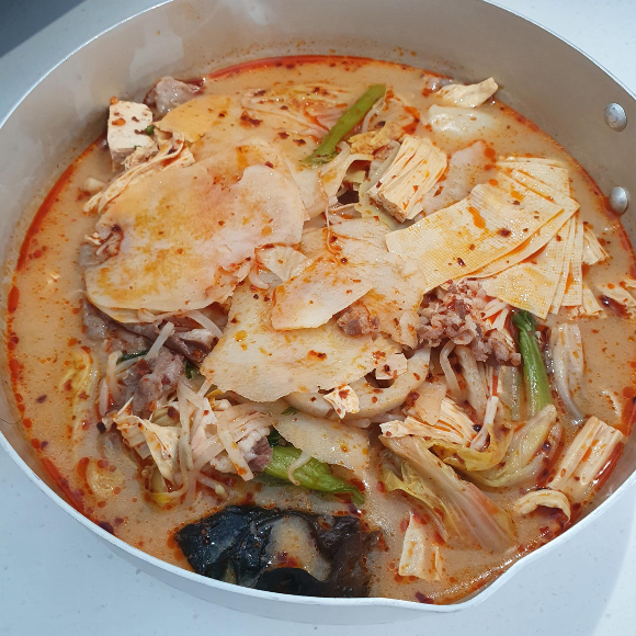 같이 먹는 친구는 좀 간이 심심하다고 해서 예전에 받은 마라탕 소스를 추가로 넣었답니다. 얼얼함과 매콤함이 더 나게 되었지만 저는 백미향의 살짝 시큼? 한 듯한 맛을 아예 못 느끼게 되어 다소 아쉬운 맛으로 되었습니다. (그래도 얼얼한 게 좋긴 합니다 입술 마비되는 맛!)