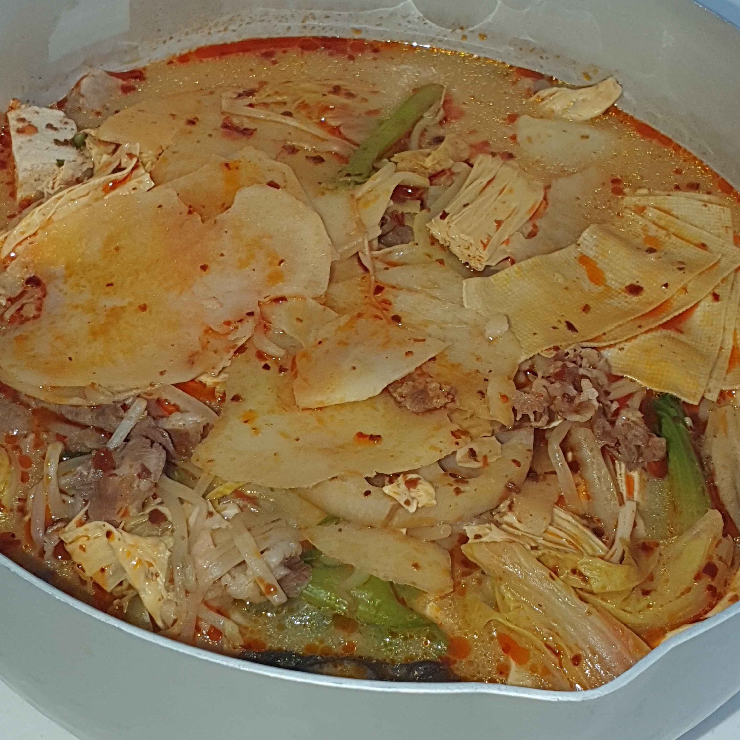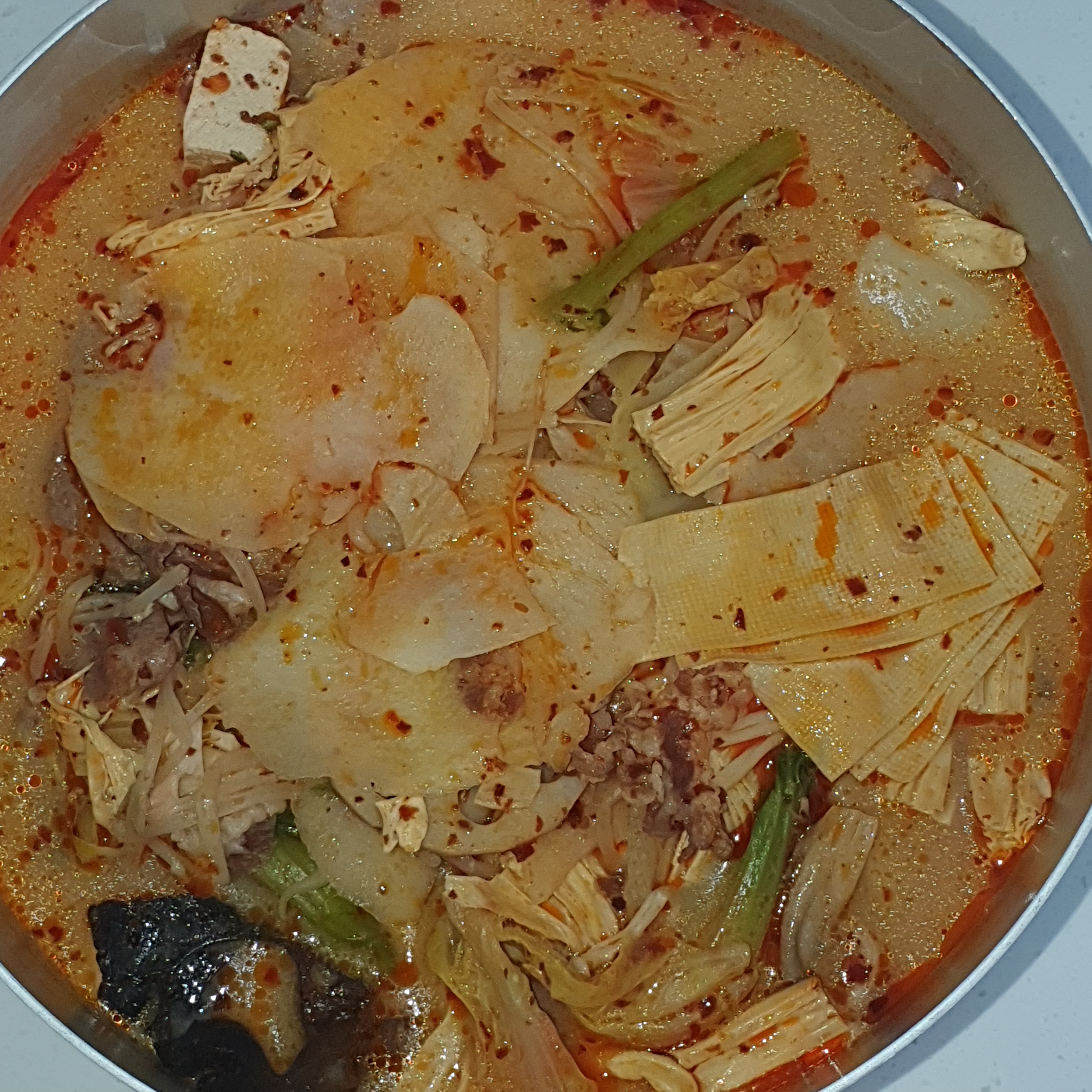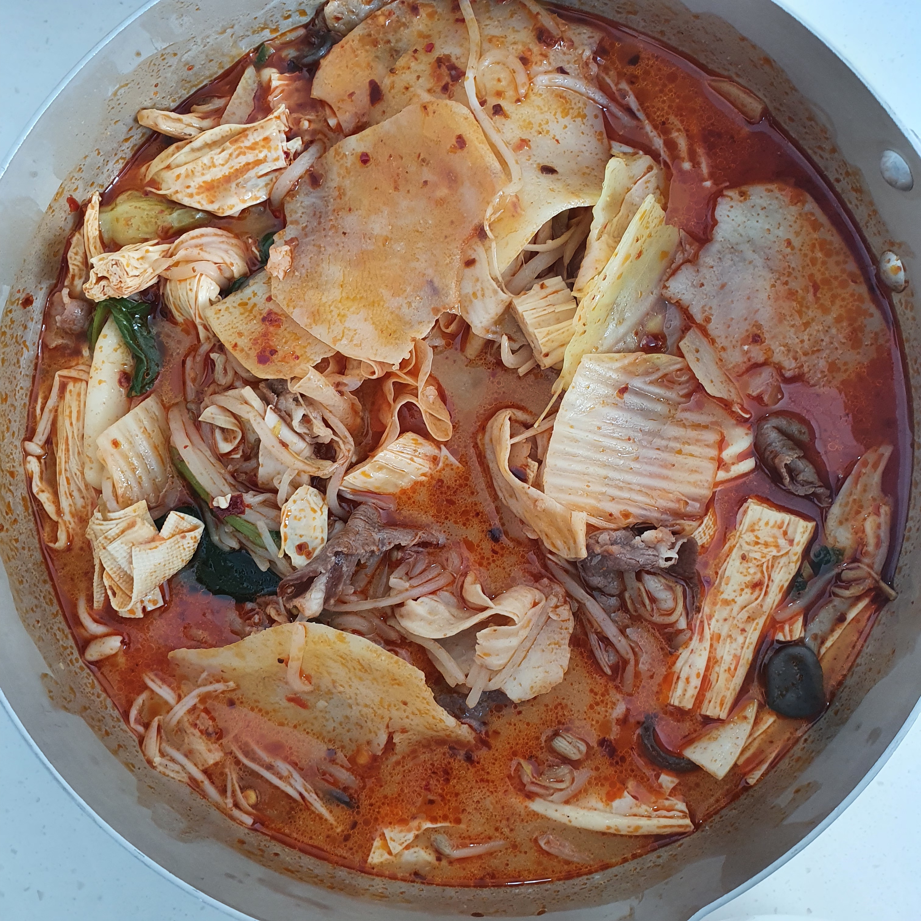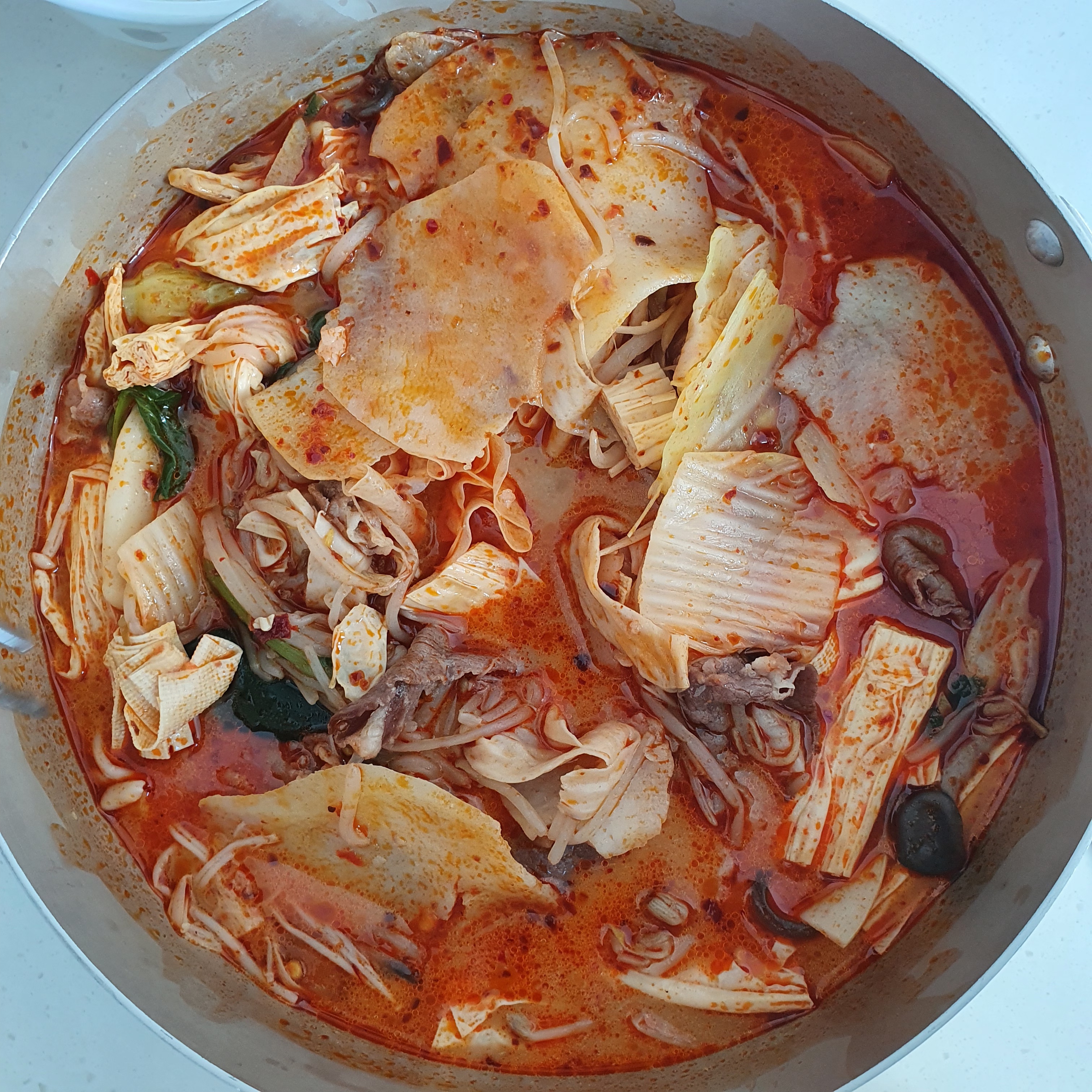 같이 먹는 친구는 좀 간이 심심하다고 해서 예전에 받은 마라탕 소스를 추가로 넣었답니다. 얼얼함과 매콤함이 더 나게 되었지만 저는 백미향의 살짝 시큼? 한 듯한 맛을 아예 못 느끼게 되어 다소 아쉬운 맛으로 되었습니다. (그래도 얼얼한 게 좋긴 합니다 입술 마비되는 맛!)
