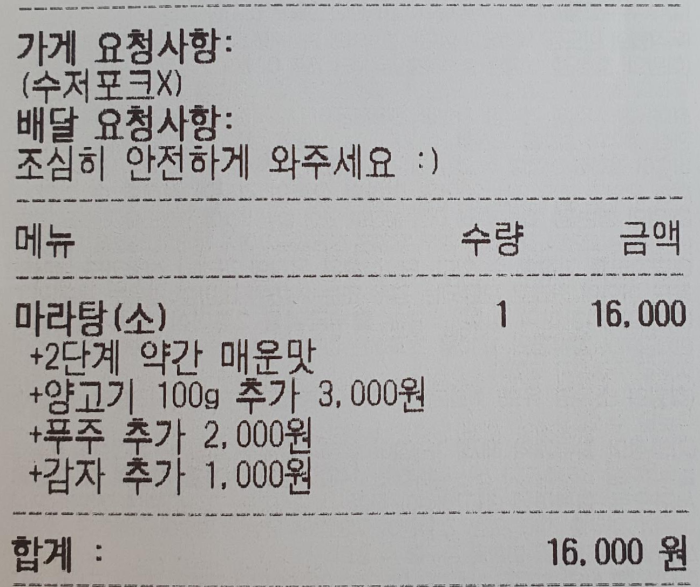 금액은 16,000원! 내 돈 내산으로 시켰습니다