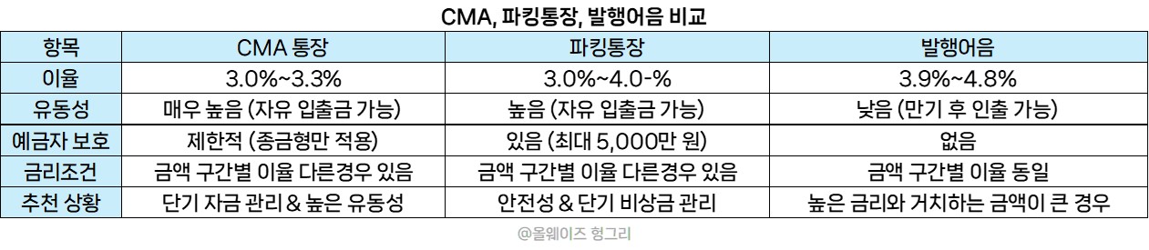 CMA 통장 vs 파킹통장 vs 발행어음 직장인 월급 재테크 비교
